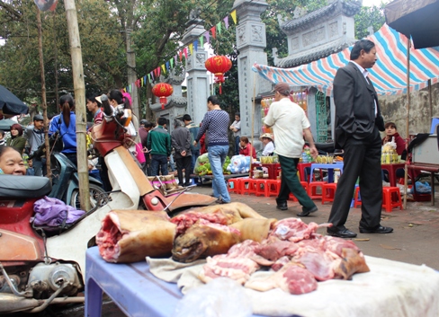 Khách đến cũng dễ dàng mua thịt chó sống được bán ở gần đình làng...