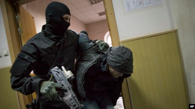Cảnh sát Nga áp tải một người đàn ông được cho là một trong năm nghi phạm trong vụ giết hại ông Nemtsov vào phòng xử án ở Moscow.