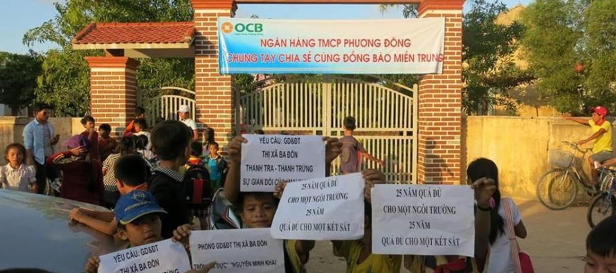 Các em học sinh biểu tình trước cổng trường tiểu học Cồn Sẻ (ảnh; Facebook Tin Mừng Cho Người Nghèo)