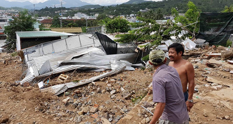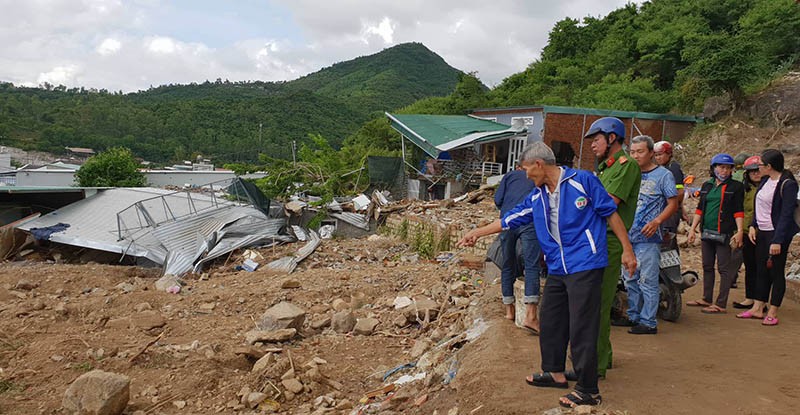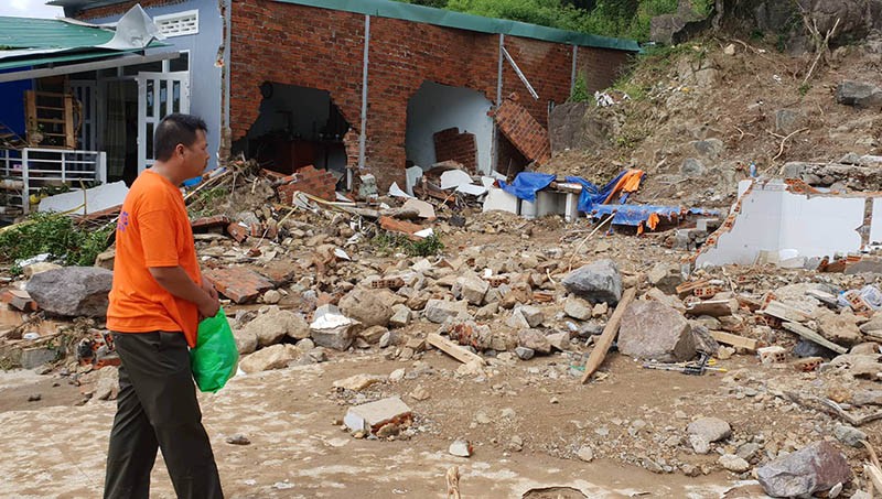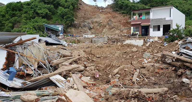 Hơn 10 căn nhà dưới chân núi ở tổ dân phố Hòa Tây, phường Vĩnh Hòa, TP Nha Trang (Khánh Hòa) đã bị nước phá hủy hoàn toàn. Nhiều căn giờ chỉ còn trơ trọi nền cùng đất đá ngổn ngang.