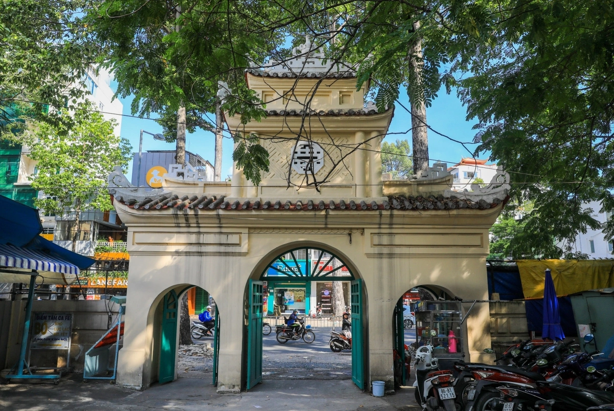 Cổng chính vào lăng mộ nhà bác học Trương Vĩnh Ký hướng ra đường Trần Hưng Đạo. Là người theo Thiên chúa giáo nhưng khi tạ thế, cổng lăng của ông lại có kiến trúc theo kiểu tam quan của các ngôi chùa Phật giáo.
