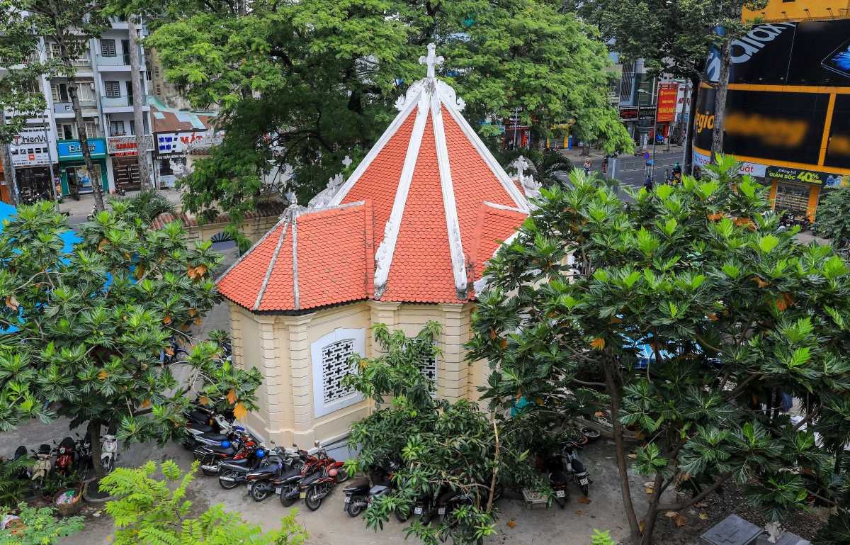 Ngói vảy cá được lợp trên tám cạnh mái của căn nhà. Trên những đường viền nối các mái đều trang trí đắp nổi hình rồng kèm với biểu tượng thánh giá.