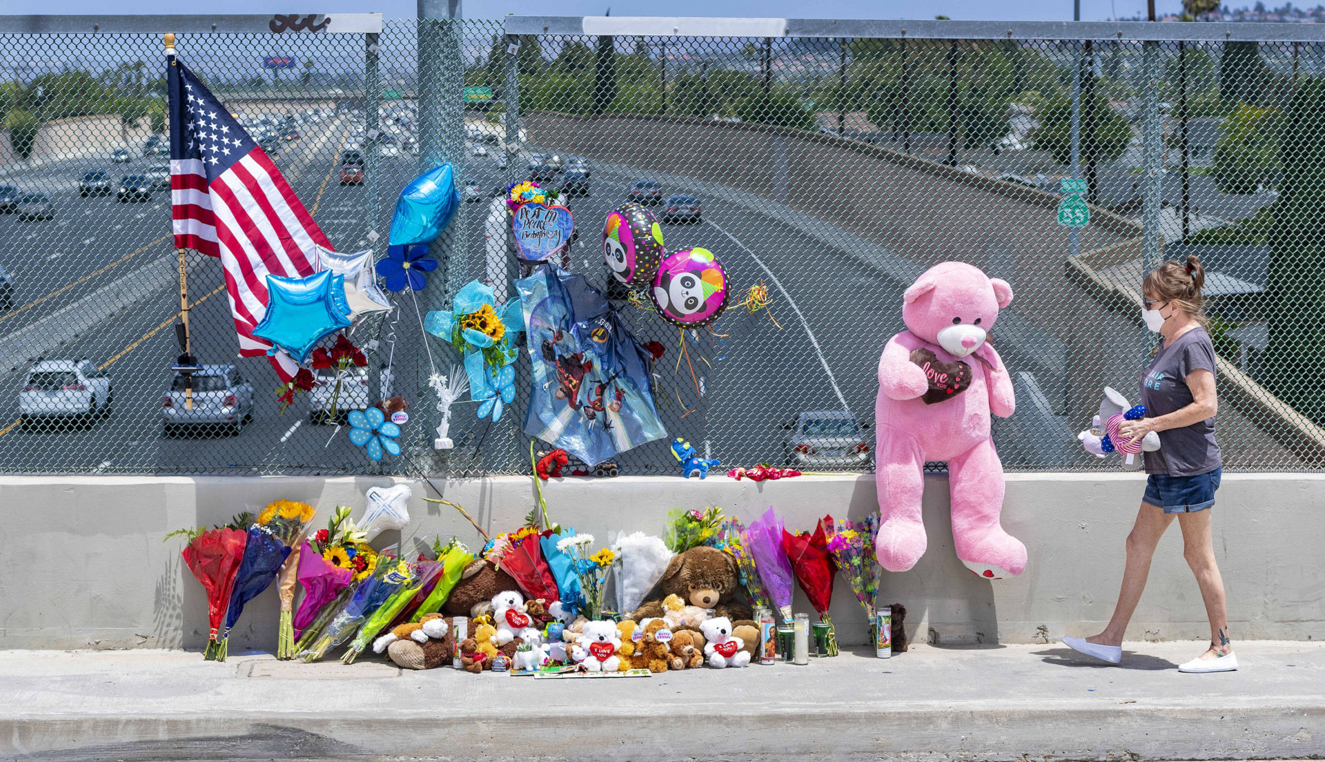 Nhiều người đến cầu vượt trên xa lộ 55 ở Orange để tưởng niệm cậu bé 6 tuổi bị bắn chết trên xa lộ 55 vào sáng Thứ Sáu, 21 Tháng Năm.