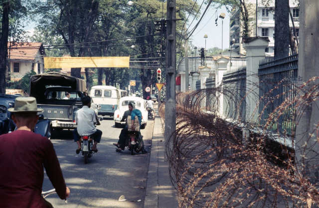 Saigon 1965 – Photo by William S. Fabianic. Đây là đường Phan Đình Phùng (nay là đường Nguyễn Đình Chiểu) lúc còn cho lưu thông2 chiều. Khúc này là ngã tư Phan Đình Phùng và Trương Minh Giảng (nay là Trần Quốc Thảo). Đi tới nữa là ngã ba Phan Đình Phùng – Nguyễn Gia Thiều (chỗ có thấy hàng rào sắt màu xanh lá cây), là Consulat Général de France (trước 1966 hoặc 1967 là trường tư thục Lê Quý Đôn) do KTS Phạm Văn Thâng thiết kế. Ở bên phải của người chụp tấm hình này là Toà Tổng Giám Mục, kế bên là biệt thự của tổng giám đốc công ty Shell do KTS Nguyễn Văn Hoa thiết kế. Còn ở bên trái là biệt thự của tổng giám đốc Chartered Bank, cũng do KTS Hoa thiết kế đầu thập niên 1960, đã bị chính phủ đập phá để xây trường mầm non và chỉ còn lại hồ bơi.