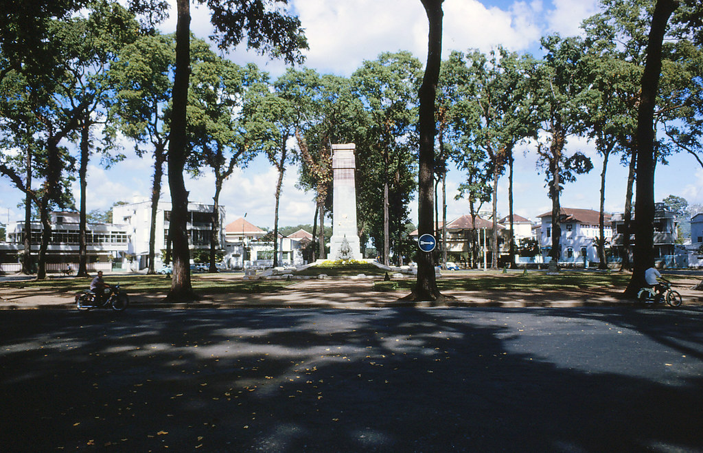 Saigon 1971 – Tượng đài Trần Nguyên Hãn nhìn từ trên cầu vượt dành cho khách bộ hành. Phía sau tượng đài nhìn thấy phần chân của cầu vượt bộ hành thứ hai từ bùng binh nối qua bến xe buýt. Nhà có mái ngói cao nhất trong hình là Nhà chú Hỏa, trên đường Phó Đức Chính.