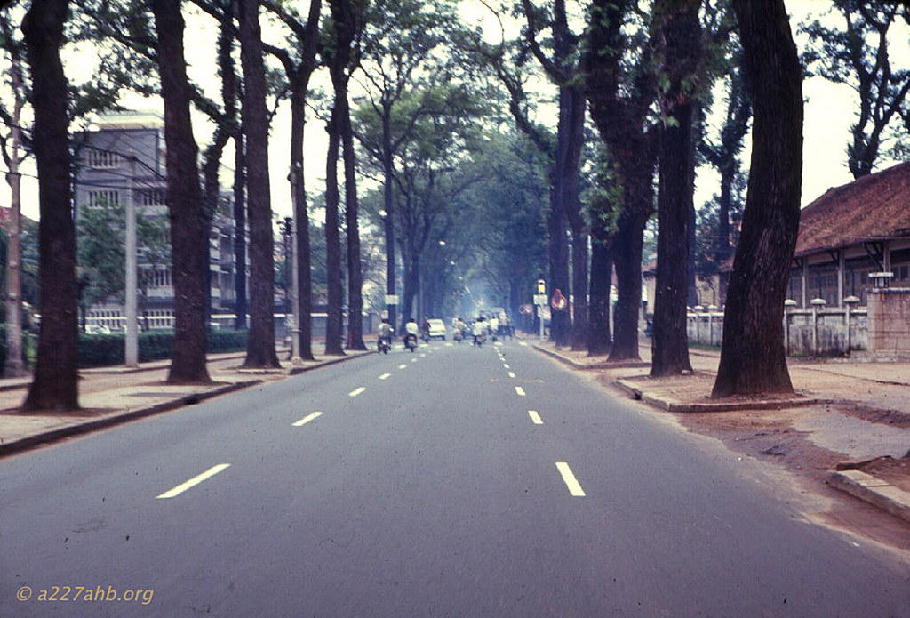 Saigon 1969 – Đường Pasteur, bên phải là Đại Học Kiến Trúc, bên trái là công viên Vạn Xuân. Sau này công viên này bị xóa bỏ và đưa vào khuôn viên của nhà thi đấu Phan Đình Phùng ngày nay.