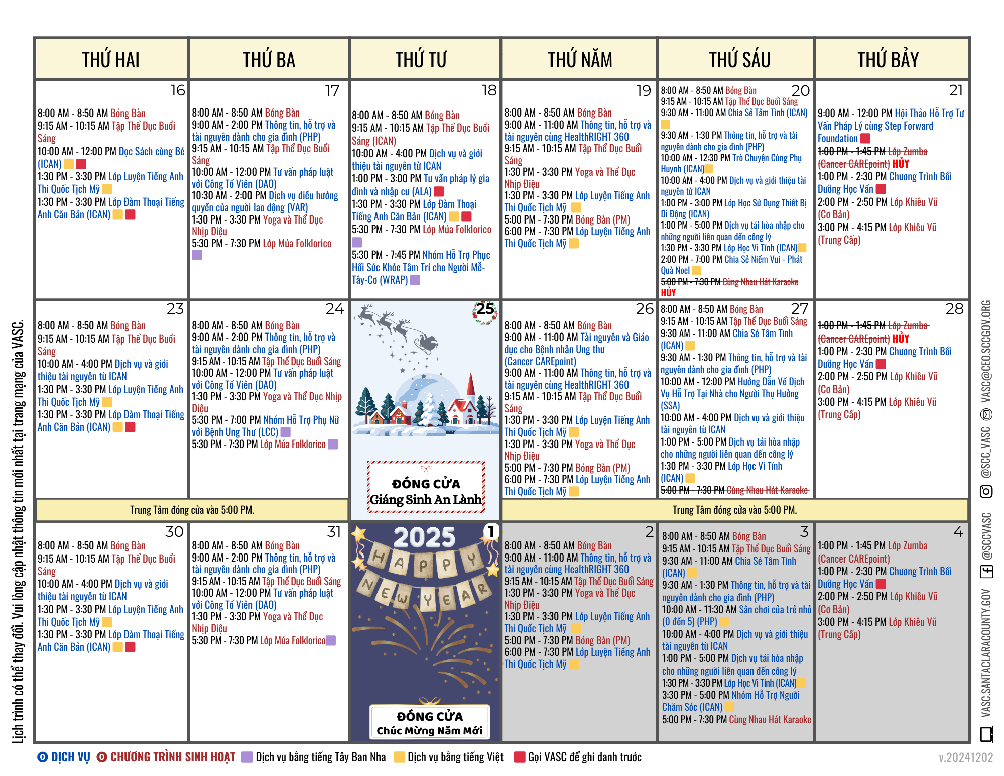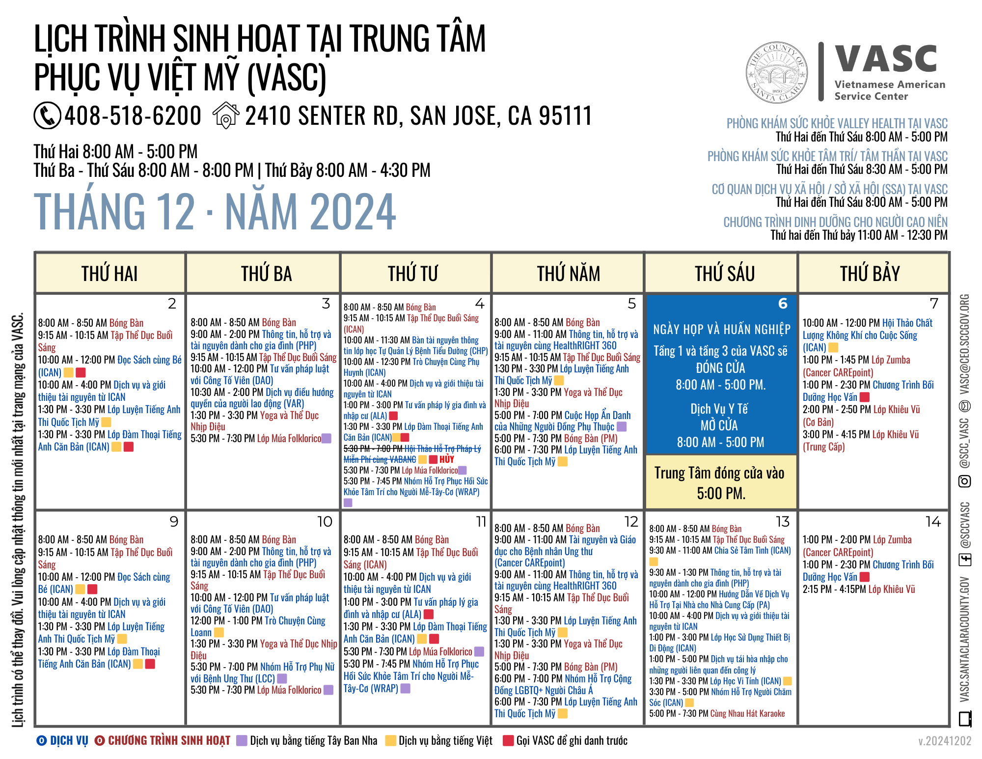 Quí vị có thể tìm hiểu thêm về những chương trình của VASC, xem lịch hàng tháng, thực đơn cho chương trình Dinh Dưỡng cho Người Cao Niên, cũng là các thông tin khác về trung tâm qua trang mạng.