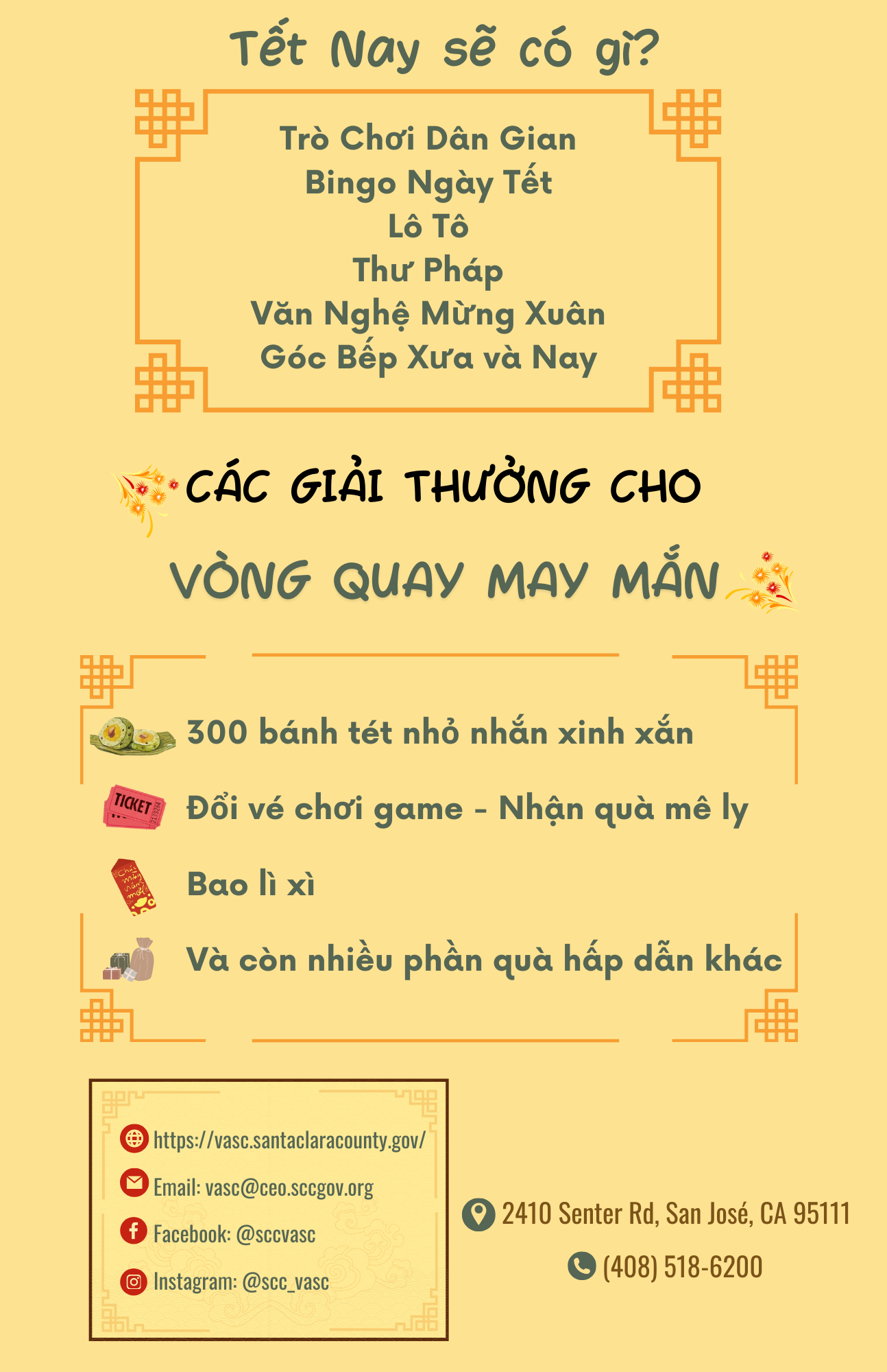 La primavera está próxima y las flores florecen. Para comenzar el año de la víbora, el Centro de Servicios Vietnamita Americano (VASC) lo invita cordialmente a unirse a nuestro evento anual del Nuevo Año Lunar, “Tet tradicional vs. Moderno", el cual se llevará acabo el sábado 18 de enero de 2025, de 10:00 a.m. a las 4:00 p.m. Este año VASC tiene el honor de organizar el evento junto con nuestros increíbles socios: el Departamento de Servicios de Salud Conductual (BHSD), la Oficina del Fiscal de Distrito (DAO) y la Red Internacional de Asistencia para Niños (ICAN).