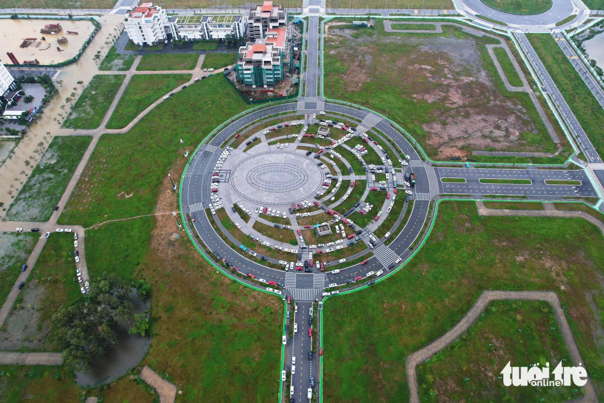 Công viên Khu hành chính tập trung là nơi được người dân phường Vỹ Dạ, An Cựu...ở Huế đưa xe ô tô đến tránh lụt - Ảnh: NHẬT LINH