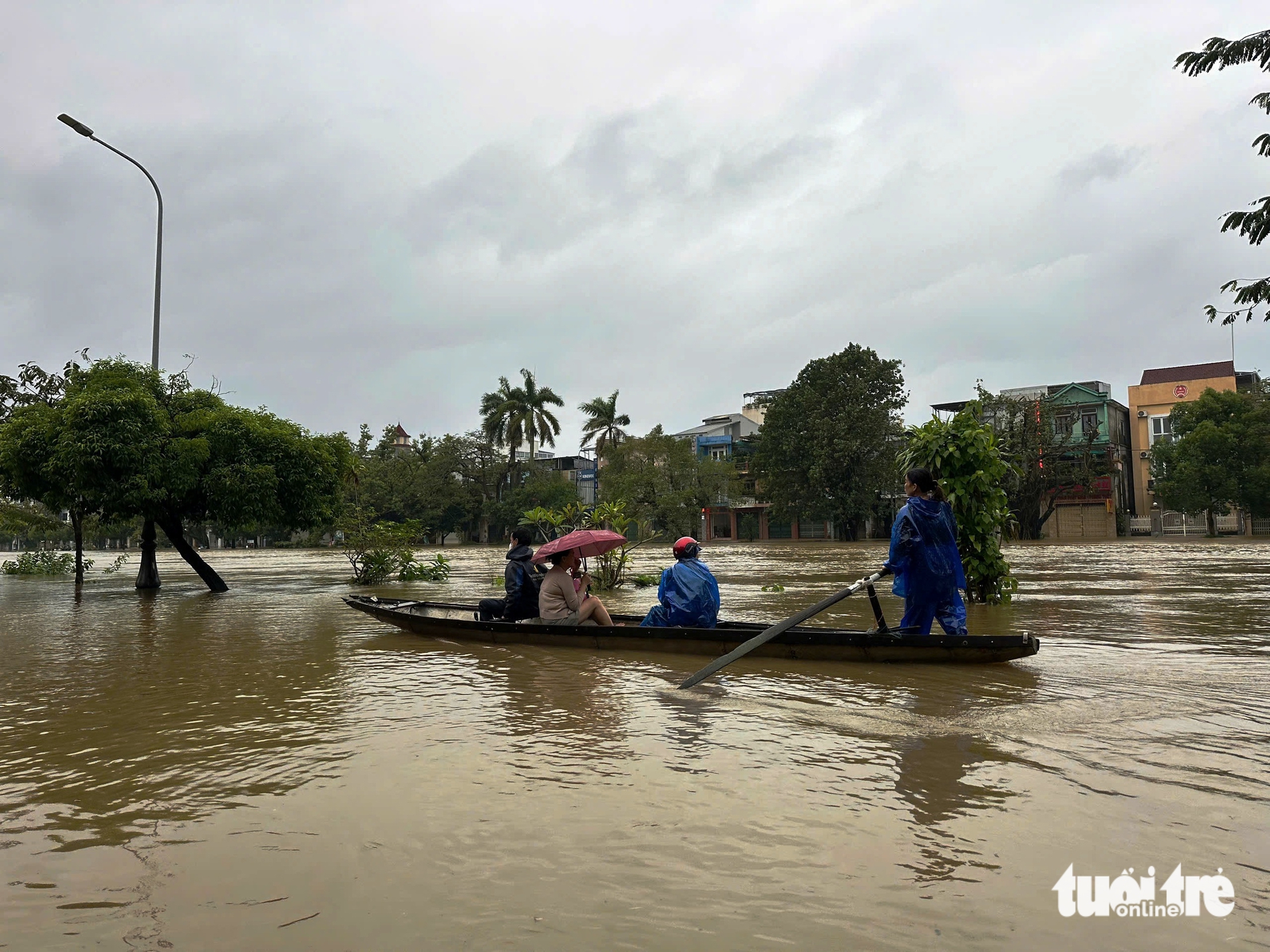 Nước sông Hương dâng cao, người dân phải dùng xuồng để di chuyển, đi lại giữa đường - Ảnh: NGUYÊN QUÝ