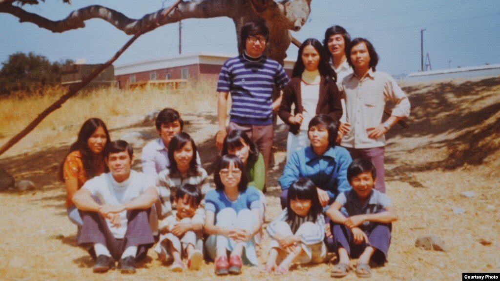 Tác giả mặc áo màu xanh biển, ngồi bên phải, chụp hình kỉ niệm với bạn trong Camp Pendleton năm 1975 (ảnh Bùi Văn Phú)