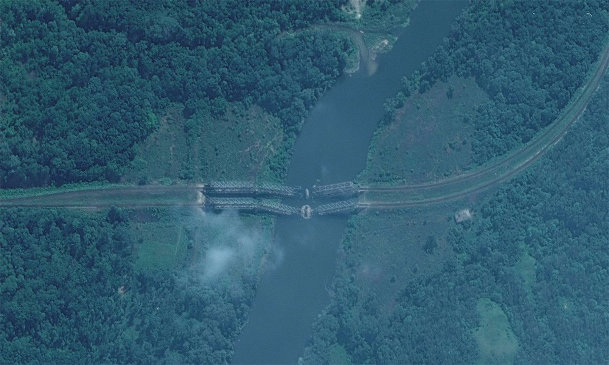 Ảnh vệ tinh cầu đường sắt phía tây bắc Severodonetsk bị đánh sập ngày 11/6. Ảnh: Maxar.