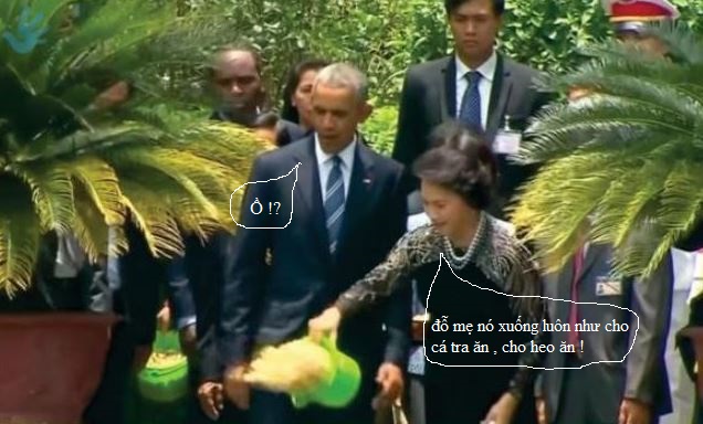 Cuối cùng, có lẽ do sốt ruột vì phải “diễn” quá lâu, bà Ngân bèn cầm cả xô thức ăn đổ hết xuống ao cho nhanh gọn rồi quay đi, trong khi Tổng thống Obama còn kịp vẫy tay “chào” đàn cá một cách thân ái!