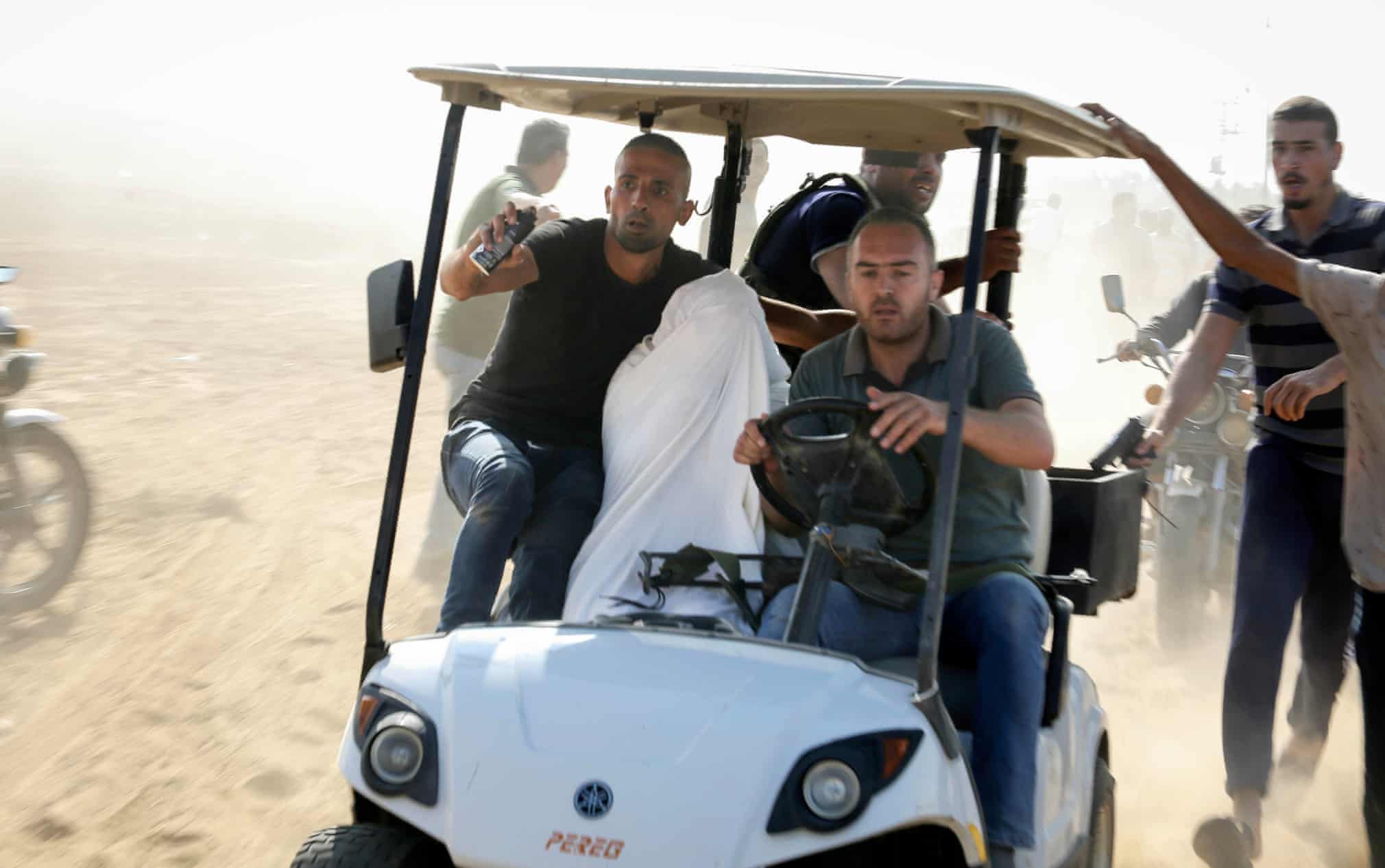 Người dân Palestine khiêng thi thể của những người thiệt mạng trong cuộc không kích của Israel trước khi chôn cất họ ở Khan Younis, Gaza, vào thứ Tư, ngày 11 tháng 10. (Abed Rahim Khatib/Picture-Alliance/Getty Images)
