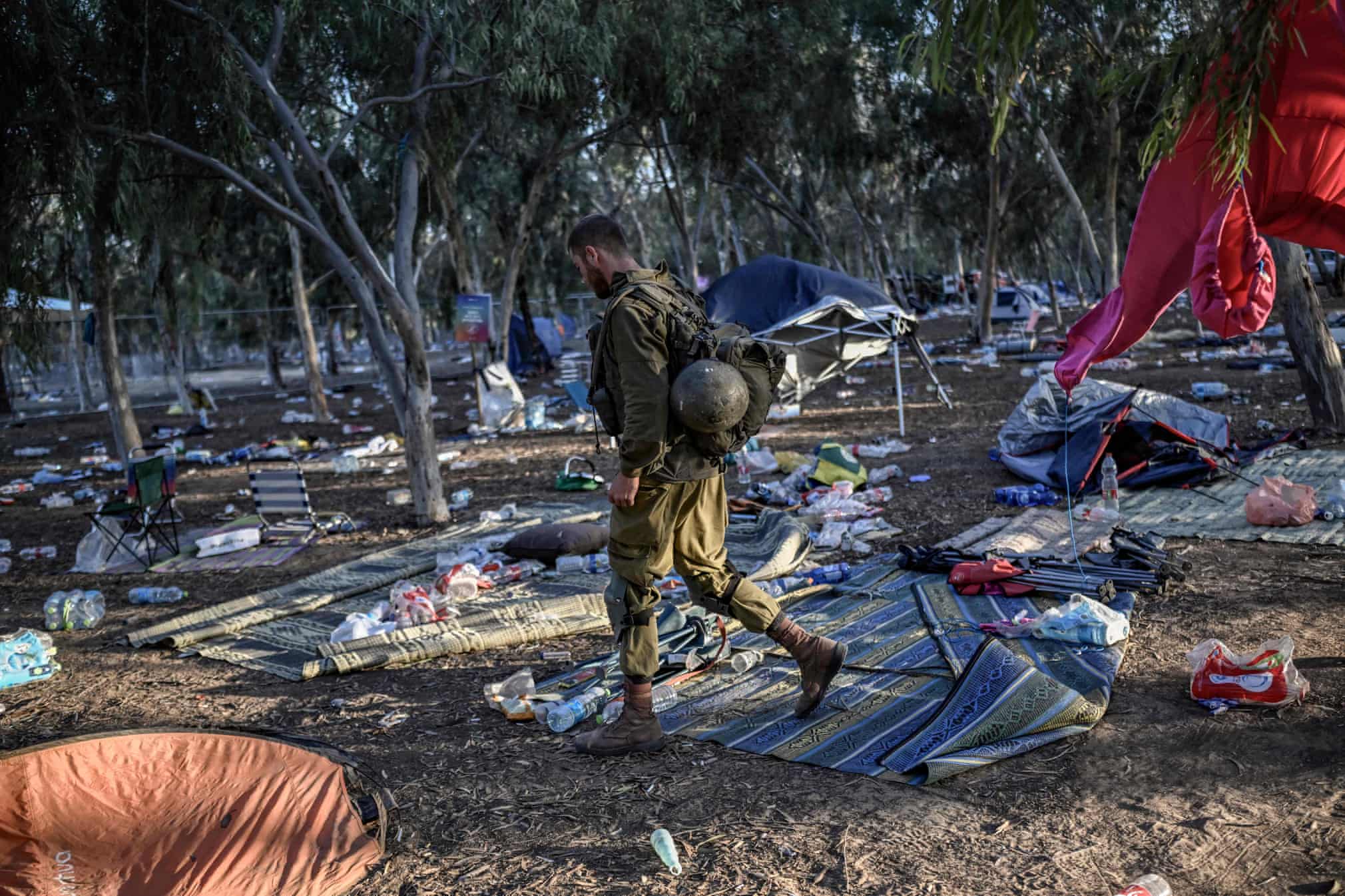 Một người lính Israel kiểm tra gần khu định cư Be'eri, nơi 270 người đã bị phiến quân giết chết trong khi tham dự lễ hội âm nhạc "Supernova". (Aris Messinis/AFP/Getty Images)