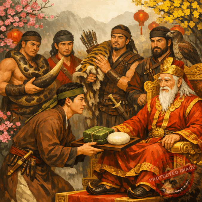 Vua Hùng Vương thứ 6 toàn quyền trị vì đất nước. Khi có ý định truyền ngôi, Vua cho các hoàng tử biết là ngôi báu sẽ về tay vị nào có phẩm vật quý nhất dâng cúng tổ tiên vào dịp Tết. Đề ra cuộc thi, nhà vua có ý thẩm định tài năng của các hoàng tử để ông có thể chọn được người kế vị tài giỏi nhất.
